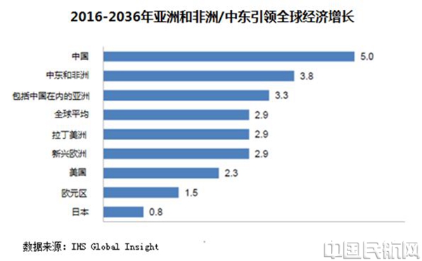 IHSGlobalInsight预测2016-2036年间世界实际GDP将以年均2.9%的速度增长。新兴市场增长速度将高于全球平均水平,但低于21世纪初期的增速。亚洲(日本除外),由印度和中国引领,增长最快,中东、非洲、拉丁美洲和东欧随其后。较成熟经济体的增速将低于全球趋势,其中美国增长最快,其后是欧洲。日本的增长非常缓慢,预计年均增速低于1%,反映了与人口萎缩和老龄化相关的深层次的结构性问题。见下图2。