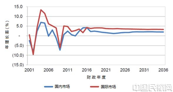 相比于成熟的美国国内市场,对美国的航空公司来说,国际市场仍处于增长阶段,特别是自2004财年以来。2015年是这种趋势的一个例外,预计2016年航空公司还是会继续把重点放在国内市场。2017年开始,国际市场(包括干线和支线航空公司)的登机旅客数、RPM、ASM将重新开始超越国内市场,这3项的数值在2017-2036财年间平均年增长率将分别为3.6%、3.5%和3.5%。见图5、图6、图7、图8。