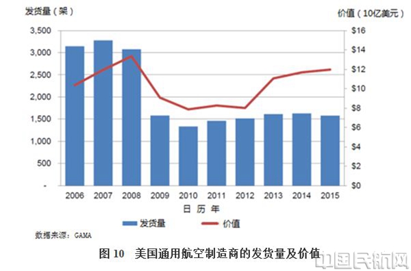 2015年,通用航空业经历了自2010年以来的第一次交付量下降。与上一年相比,美国制造商的单发活塞式飞机交付量继续增长,公务机交付有适度增长,涡轮螺旋桨飞机的交付下降10%,更小的多发活塞式飞机的交付下降了40%。根据GAMA公布的数据,2015财年美国通航飞机制造商交付了1581架飞机,比2014财年减少3.1%。这是发货量4年增长后的首次下降。单发活塞式飞机2015年增长3.4%,但是多发活塞式飞机发货量在总的活塞式飞机交付量中下降了0.6%。按涡轮的类别,涡轮喷气式飞机增长0.8%。2015年,涡轮螺旋桨飞机交付量下降10.0%,总的涡轮飞机发货量下降5.3%。见图10。