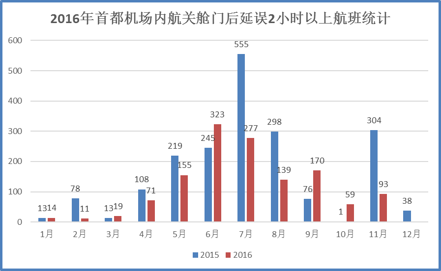 也是从2012年起,伴随着首都机场协同决策机制建设,运管委开始关注旅客机上等待情况。2015年,民航局《关于落实2016年航班正常管理措施及检测指标的通知》(局发明电〔2015〕2199)中正式制定了“机场当月关舱门后延误2小时(含)以上航班超过20班(含),查明原因后将对相关责任单位进行通报批评”的管理措施。以首都机场为例,2016年1-11月份,共出现机上等待2小时(含)以上航班1331架次,虽然较2015年1-11月份的1910架次减少了30.31%,但总量还是较高。