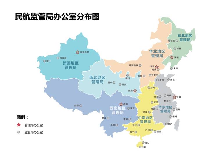 依托各地方现有医疗急救中心(120)成熟体系,按社会需求在县、市和省一级行政辖区联合搭建空中120平台,协同地方急救中心提供空地立体化救援服务。从便于航空安全管理角度出发,可参照民航行政管辖区域划分(七个地区管理局和42个监管局),在七个民航地区管理局辖区设立综合控制中心,在42个监管局对应省一级120急救平台设立分控中心,协调各一线应急中心事务,同时也为民航安全监管提供抓手。民航行政管理辖区划分如图所示: