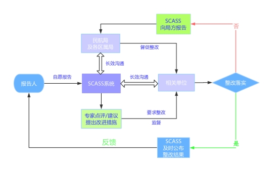 SCASS应与民航局、各区属局和相关单位建立长效沟通机制。当专家对报告信息给出合理点评或建议时,系统应及时跟相关单位交流改进措施,要求其在规定时间内完成危险源的整改工作。SCASS应监督相关单位落实排除危险源主体责任,当相关单位拒不落实或者落实不到位,SCASS应向局方报告,由局方进一步采取措施督促完成整改。系统还应及时公布整改结果,完成自愿报告的闭环工作(如图4-2所示),从而提高飞行员自愿报告的积极性和SCASS的权威性。