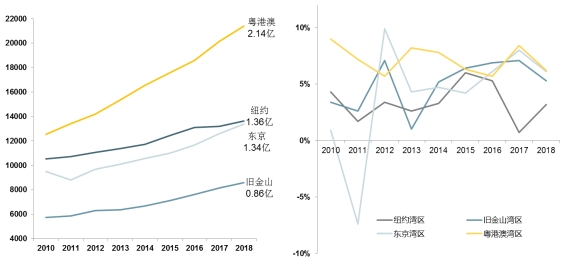 粤港澳大湾区由“9+2”(广东9市及香港、澳门特区)城市群构成,湾区面积、人口、经济增速等远超过国际三大湾区,并且经济总量有望于2022赶超纽约和东京湾区(其中深圳GDP总量已于2018年已经超过香港位居湾区之首)。最大的不同还在于在“一国两制”框架下形成创新聚集生态。