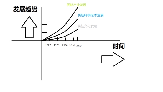 虽然民航在我国的发展只有短短几十年,但如今我们早已成为民航运输大国,正向民航强国迈进。然而,因为我们发展时间短、发展速度太快,造成真正属于我们自己的民航技术与民航文化非常欠缺,也就是我们平时说的缺乏底蕴。没有底蕴的发展到后期就会缺少动力,为了弥补先天的不足,最近几年国家花大力气发展民航先进技术。C919的试飞成功标志着我们在这方面取得了巨大进步,之后国家又提出两翼齐飞,发展通航产业,争取早日补齐我国民航最大的短板。但我国的民航文化建设一直处于小打小闹的状态,仅仅是跟着国家的号召在走。我们用一个简单的走势图来表现我国民航发展历史的几项指标: