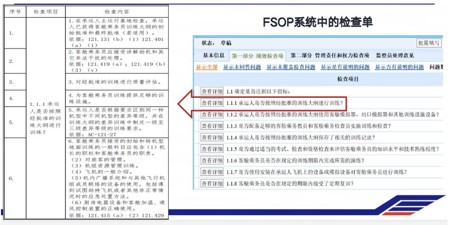 以“EPI5.1.1客舱乘务员训练”监察项目检查为例。如图二,右侧显示的是简化检查单的条目内容,例如第1.1.1条“承运人是否按照经批准的训练大纲进行训练?”,而在完整版的检查单中,就有20条的任务指南,包括依据哪些规章,查阅哪本手册,在哪检查,检查哪些内容等等。