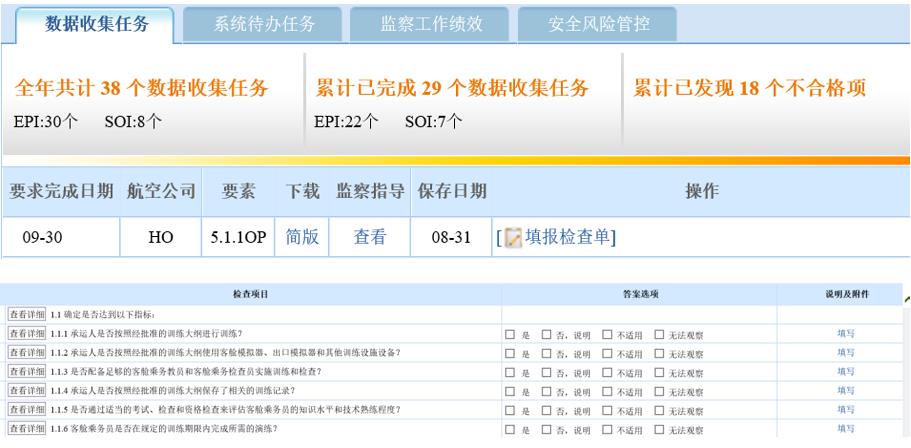 实施检查时,监察员通常的操作流程是,打开FSOP系统首页的任务提示栏,点击数据收集任务栏中的“填报检查单”(如图一)。这份检查单随时可以下载,但下载后是简单版,信息并不全面,所以,更有效的做法是,事先就将完整版的检查单,套用行政检查记录单的格式,形成一份行政检查记录单,一是为了方便作为检查内容的检索使用,不容易漏项;二是方便记录发现的问题,可以直接在行政检查单中逐条对应描述存在的问题,也能比较准确地描述存在的问题,因为检查内容中有列明依据的规章要求的符合条款;三是方便公司认可签字,包括分管领导签字;四是一目了然,同时方便回顾总结、更方便跟踪整改措施的落实闭环。