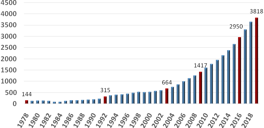 如图2-1所示,1978年改革开放,当时我们全民航的飞机数量只有144架。经过民航的两次改革后,1992年的飞机数量已经翻了一倍,达到了315架,这次翻倍用了14年。到2003年,中国民航第三次改革完成,飞机数量达到664架,又翻了一倍,这次翻倍用了11年。2009年,北京奥运会之后,机队规模达到了1417架,这次翻倍仅仅用了6年的时间。在如此大的基数下,只用了7年的时间,到2016年飞机数量又翻了一倍达到了2950架。近几年,机队规模增速放缓,即便这样,三年的时间增加了将近1000架,到2019年末达到了3818架。中国民航机队规模已经跻身世界前列,国内几大航空公司更是在全球前十位航空公司中占有一席之地。