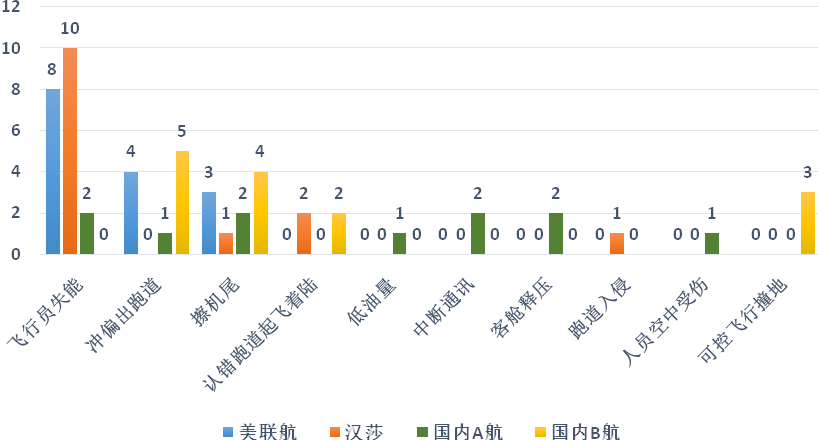 笔者将美国联合航空(以下简称美联航)、汉莎航空(以下简称汉莎)以及国内两家与之规模相近的航空公司近10年责任原因严重事故征候进行了统计和对比。