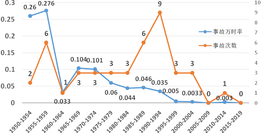 可以看出,上世纪90年代后,虽然还是发生了几次重大事故,但是运输航空重大事故万时率和次数并没有伴随着机队规模高速增长而增长,运输航空重大事故万事率整体处于下行通道。这个绝不是偶然的,除了得益于飞机可靠性的提升和先进技术的应用,更与我们几代民航人不断总结经验教训,不断健全规章体系、不断完善安全管理、不断提升业务能力,不断加强作风建设密不可分。