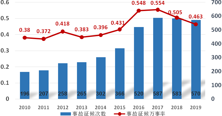 从图2-3可以看出,近10年运输航空事故症候万时率始终控制在0.6%的目标值以下(2018年前目标值为0.5%),但是从2016年开始,事故征候万时率还是处于较高风险值的区域,再加上机队规模的增加,事故征候的数量从300多次迅速增加到500多次,这其中很多次都与事故擦肩而过。还有些一般事件,虽然没有造成伤亡,但是造成了很大的社会影响。
