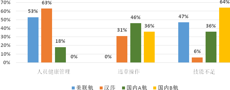 分析这些严重事故征候事件发生原因,如图2-4、图2-5所示,美联航和汉莎航空主要是人员健康管理(机组失能),违章和技能原因占比较低。国内两家航空公司的违章和技能类原因占比较大,发生的事件主要有冲偏出跑道、擦机尾、客舱释压、中断通讯、可控撞地等事件。这反映出我们队伍整体的作风纪律、理论水平和操作技能方面还有很大的提升空间,在队伍的职业化素养方面与世界优秀航空公司还存在较大差距。