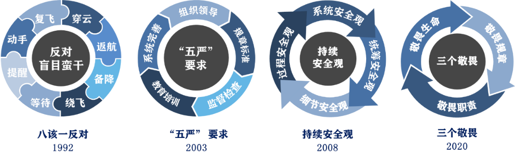 过去的几十年,中国民航提出了“八该一反对”、“五严”、“持续安全”等要求和理念,安全管理经历了被动管理阶段、经验管理阶段、制度管理阶段、体系管理阶段。为了中国民航更高质量的发展,提升队伍的职业素养,我们的安全管理必然由体系管理迈向文化管理的阶段。