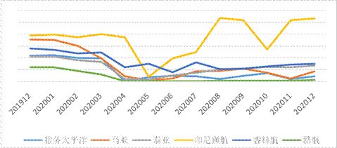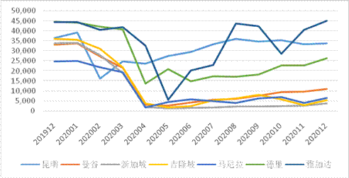 表3:2019年12月-2020年12月昆明与南亚东南亚主要机场货运航班变化趋势