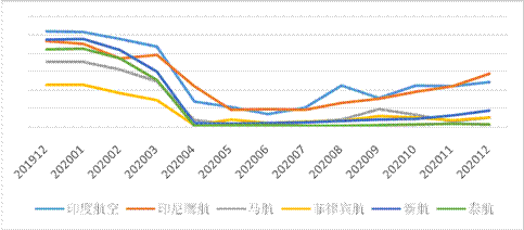 表1:2019年12月-2020年12月昆明与南亚东南亚主要机场客运航班变化趋势