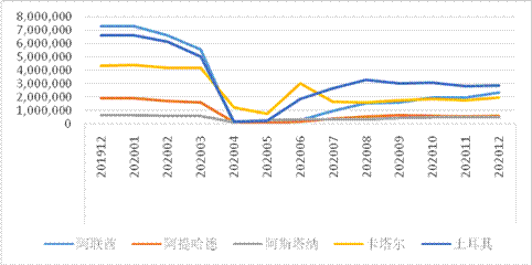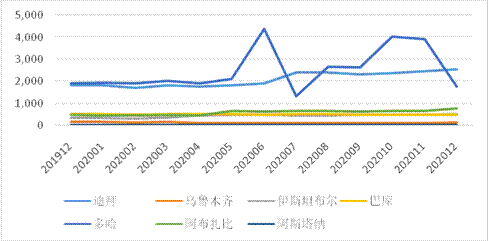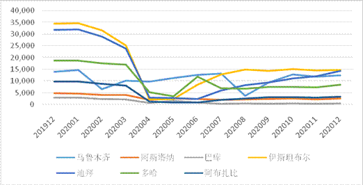 表10:2019年12月-2020年12月乌鲁木齐与中亚西亚主要机场货运航班变化趋势