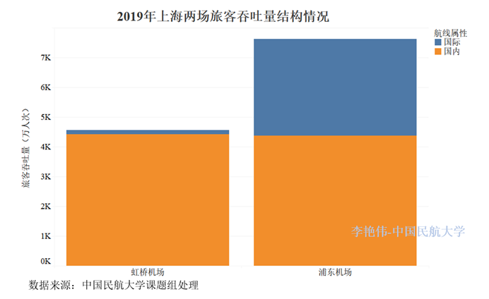 在航空运输结构方面,上海两场依据其功能定位,浦东机场承载了主要的国际航空任务,2019年国际旅客吞吐量达到3249万人次,占机场旅客吞吐量的42.67%。浦东机场是我国国际旅客吞吐量规模最高的机场。两场的国际、国内旅客吞吐量结构如下图所示。
