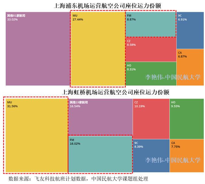 比较有趣的现象是,除了东航在两场运行外,南航、国航、春秋、吉祥,也都选择了在上海两场运作的模式,且在两场投入的运力份额相近。