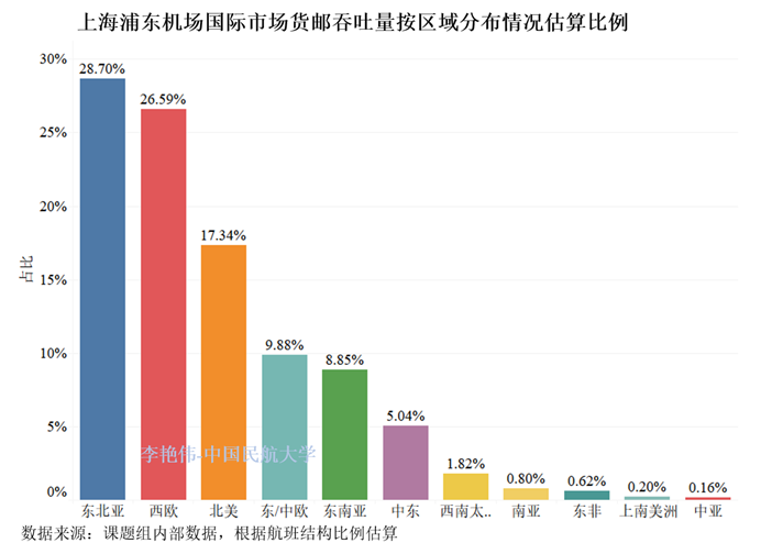 将浦东机场国际货邮吞吐量,细分其目的地结构,根据航线结构估算,东北亚目的地的货物比重占28.7%,西欧为27%,北美为17%,东欧/中欧10%,东南亚9%。由此可见,上海航空货运枢纽已经构建起覆盖全球主要区域的货运网络,是保障我国对外经济贸易中航空货运高效、快速流动的核心枢纽。