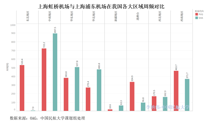 从浦东与虹桥两场运营的国内航班来看,两场虽然都从事国内市场的运营,但在区域与航线市场也保存了一定差异性。浦东机场与虹桥机场在我国各大区航班周频对比如下所示。