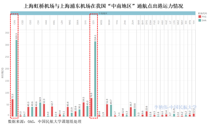 虽然从总量上来看,两场在航班频次上连通中南地区的厚度相近,但从座位运力上衡量,虹桥机场在中南地区的核心枢纽广州机场、深圳机场保持了更好的运力投入;浦东机场则在网络覆盖面上高于虹桥机场,在中南地区的中小型机场保持运力优势。