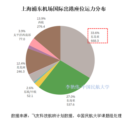 浦东机场的国际航空运输无论从运输规模上,还是从国际核心节点的网络连通度方面,在我国三大枢纽中都占有一定优势。从浦东机场的运输市场结构来看,东北亚市场是浦东机场份额最高的国际市场区域,2019年出港座位运力份额占比高达33.6%。