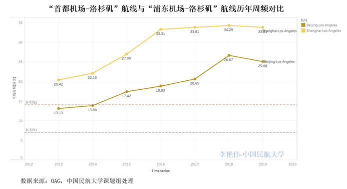 在东北亚市场占据较高份额的同时,浦东机场与主基地航司也并不甘于仅在东北亚发展,近几年在欧洲、北美、东南亚市场也频频发力。在北美洛杉矶航线、欧洲的法兰克福航线,都要高于首都机场的航班厚度,如下图所示。这两个区域市场传统上是首都机场的网络优势市场。