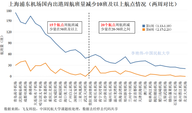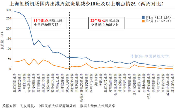 从新冠肺炎对两场国内运输市场影响来看,对浦东机场国内航线网络通达性降低影响较大的是东北地区。浦东机场国内出港航班周频变化如下图所示。在对比周期内,沈阳机场、大连机场、哈尔滨机场和长春机场四个千万级机场航班量下降明显。