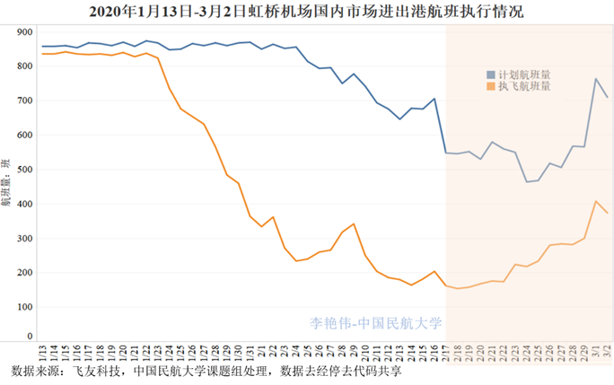 通过对1月13日-3月2日浦东机场、虹桥机场国内出港执行航班的观察可以发现,自2月17日以来,两场的航班都开始逐渐恢复。由于航班结构的不同,虹桥机场覆盖我国大中型机场航班频次较高,从航班恢复的速度上看,虹桥机场航班恢复速度略微高于浦东机场。