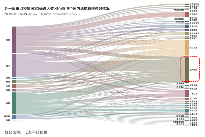 并且,随着韩国、日本等国家疫情发展趋势逐渐严峻,浦东机场成为防止东北亚等地区疫情回流的主要防控阵地。近一周重点疫情国家直飞中国内地航班座位数情况如下图所示。浦东机场连接重点疫情国家的运力最高,其次为首都机场。