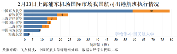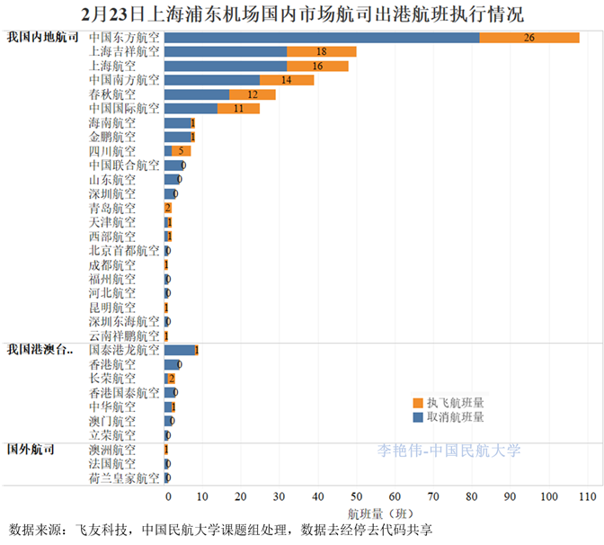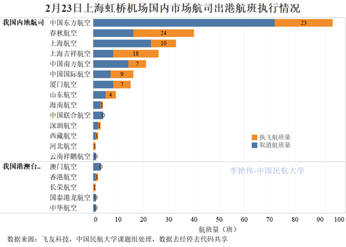 在运营航空公司方面,继续考察了2月23日当日上海两场运营航司的航班执行情况。浦东机场国内市场各航司的航班执行与取消情况如下所示,蓝色为取消航班量,橘色表示执行航班量。在2月23日,有7家国内航空公司停飞了其在浦东机场的国内出港航班,4家港澳台地区航司停飞了航班。主基地航司东航在当日的出港航班份额为23.4%,上海吉祥航空与上海航空航班份额分别为16.2%与14.4%。
