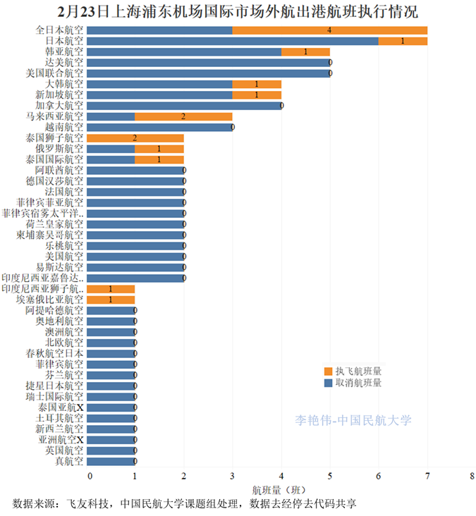 国际市场上,浦东机场在考察当日有30家国外航司停飞了航班。在运营的航空公司航班执行率也较低。