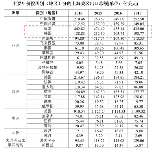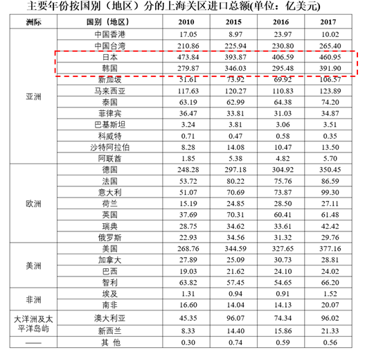 从上海关区进口总额方面考察,日本、韩国、美国、德国在进口总额方面较高。