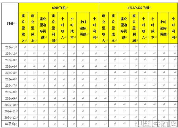 表1:××航司C909与B737/A320传统核算体系下经济效益比较表