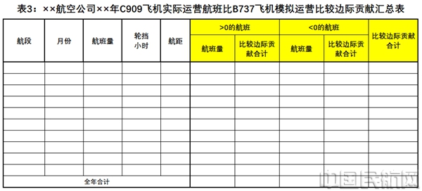 表3:××航空公司××年C909飞机实际运营航班比B737飞机模拟运营比较边际贡献汇总表