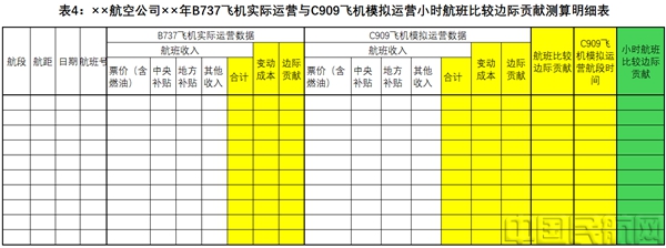 表4:××航空公司××年B737飞机实际运营与C909飞机模拟运营小时航班比较边际贡献测算明细表