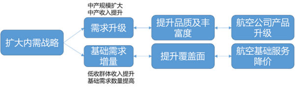 扩大内需战略的推进,一方面将带来中等收入群体规模的进一步提升,并要求消费升级,一方面将促进低收入群体的收入提高,并要求提升基础服务水平的覆盖面。对于民航企业来说,服务扩大内需战略也应从两个方面展开(如图1)。