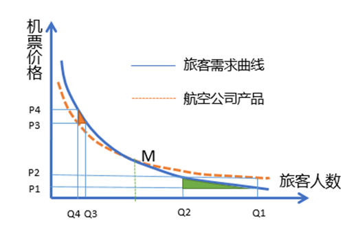 假设机票价格从P2降为P1,为方便理解,这里简化为机票价格降了100元,旅客人数将从Q2增加到Q1,但对高端旅客来讲,由于价格弹性不高,价格同样降低100元(从P4降为P3),则旅客人数从Q4升为Q3,增加的人数远远小于普通旅客增幅,而高端旅客带来的收入的增加也远低于普通旅客收入的增加(图3中橙色部分面积远低于绿色部分面积);同理,对高端旅客来说机票价格提升100元带来的收入减少也是远远低于普通旅客。因而,理性的航空公司为保证收入最大化,不应对所有的产品都采取降价的方法,而应该对低端产品降价获取更多客源,对高端产品提价获得更高的收入。