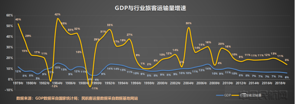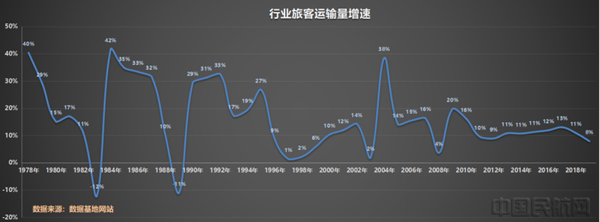 第一个是超高速增长阶段,即1978-1996年。改革开放前,由于民航业管束较多,市场供给不足,增长潜力受到抑制。经过军政分管、政企分离和航空公司市场化经营改革,市场加大了运力、航线和产品供给,行业客运量增速超20%(受重大事件影响年份除外),持续约20年。
