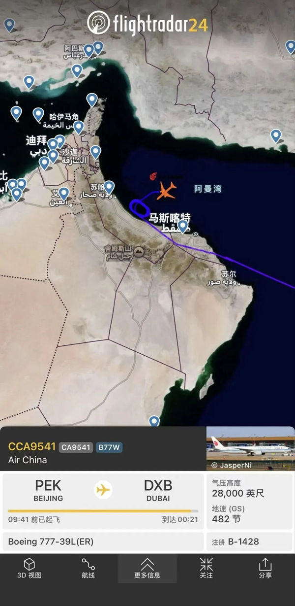 刚刚过去的3月7号周六,一幅极具张力的飞行轨迹图在网络上流传:中国国际航空由北京飞往迪拜的CA9541航班,在即将抵达目标空域时遭遇突发禁航指令,被迫在临近的阿曼上空连续盘旋了近9圈、耗时约2小时,才在收到安全确认后降落。
