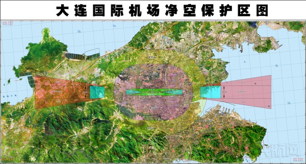 大连国际机场净空保护区域为:机场跑道中心线两侧各10公里、跑道两端外各20公里的矩形区域。具体范围:西北至东经121°18′、北纬38°4′,西南至东经121°16′、北纬38°53′,东北至东经121°48′、北纬39°2′,东南至东经121°46′、北纬38°51′。即北到金州五一路至开发区金马路,南到黄浦路至旅顺南路,东到姜家沟至老虎滩海岸沿线,西到拉树房至营城子湾以西旅顺北路的矩形范围内。