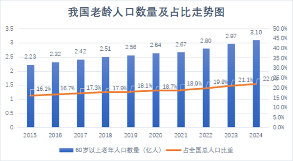 根据民政部、全国老龄办发布《2024年度国家老龄事业发展公报》显示,截至2024年年末,全国60周岁及以上老年人口31031万人,占总人口的22.0%,较2023年增长0.13亿人,其中“银发”网民数量1.56亿人,占网民数量比重约14.1%。随着60后、70后群体进入老年,我国年均新增老年人口超600万。截止2025年7月,中国60岁以上人口已突破3.2亿,占总人口比例达22.8% 。预计2033年老年人口将突破4亿。